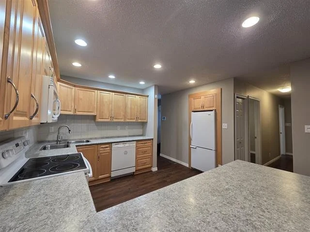 Move right into this beautiful Heritage Estates family home! The main floor features two bedrooms, a four-piece bathroom, and a kitchen with a chef-friendly layout that flows into the living room. Downstairs, discover a huge third bedroom, a second spacious bathroom, a versatile den, and a separate storage room. Outside, enjoy the sunny, fully fenced corner lot with a patio and covered parking. This home is a must see!
